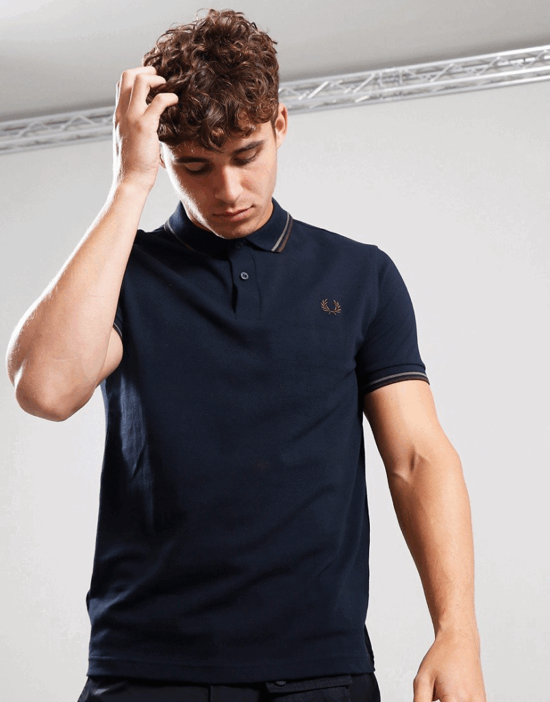Fred Perry laurel wreath logo embroidered on a navy twin-tipped polo shirt